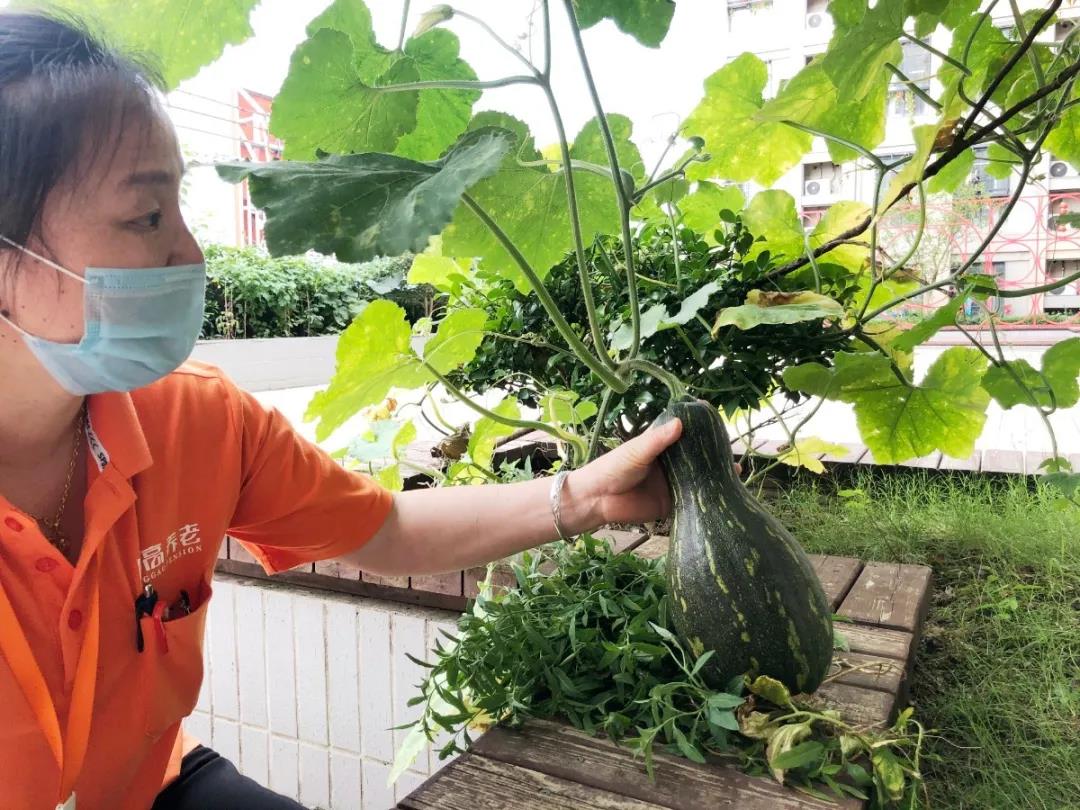 時(shí)令到了七月,一株株瓜秧順著支架往上爬,瓜藤粗壯,葉子上還帶上了一層淡淡的白毛。辣椒、苦瓜、西紅柿、茄子……梅園朗高的菜園里要啥有啥。護(hù)理員阿姨趁著風(fēng)和日麗,在菜園里采摘起來(lái),“小暑過(guò)后就是真正的夏天了,機(jī)構(gòu)里很多老人都喜歡吃清新爽口的苦瓜,吃著自己種的蔬菜,老人們一定會(huì)很開心。”
