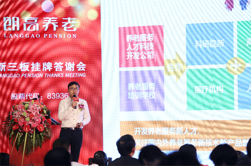 ![]() ▼朗高養(yǎng)老涂家欽董事長(zhǎng)敲響新三板掛牌開(kāi)市寶鐘